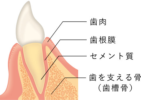 正常な歯は歯肉がピンク色で、歯を支える骨(歯槽骨)も破壊されていません。